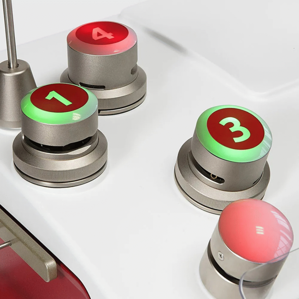 Cada pinza cuenta con un sensor óptico doble que detecta la presencia de fluidos y la correcta colocación del tubo. De esta forma, se evitan operaciones incorrectas por falta o inserción incorrecta del tubo. Cada pinza también cuenta con una cúpula iluminada de dos colores que proporciona información sobre la carga de la bolsa, así como funciones de diagnóstico.